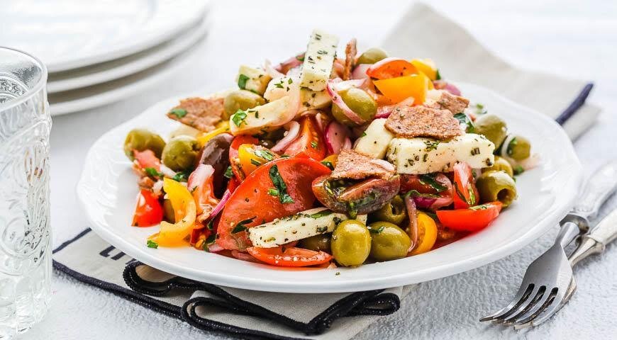 На родине сыра, в Адыгее, его традиционно подают с сочной зеленью и спелыми помидорами, посыпав пряной адыгейской солью. Мы же предлагаем сначала замариновать сыр в смеси соли, трав и оливкового масла, а затем добавить к помидорам. ИНГРЕДИЕНТЫ Для маринованного сыра: Для салата: ПОШАГОВЫЙ РЕЦЕПТ ПРИГОТОВЛЕНИЯ Шаг 1 Адыгейский сыр нарежьте небольшими брусочками. Листья тимьяна или орегано смешайте с солью и насыпьте на тарелку. Обваляйте кусочки сыра в этой смеси, затем полейте маслом и аккуратно перемешайте и оставьте на час. Сыр можно замариновать заранее, переложить в сухую емкость и убрать в холодильник, где он может храниться до 4-х дней. Шаг 2 Помидоры разрежьте на 4 части (черри – пополам), лук нарежьте тонкими полукольцами. Смешайте в миске лук и помидоры, приправьте уксусом, 2 ст.л. оливкового масла, душистым перцем, ½ ч.л. соли, щепоткой черного перца и сахара. Бережно перемешайте и оставьте на 15-20 мин. Шаг 3 Наломайте хлебцы. Смешайте с помидорами, оливками и кусочками