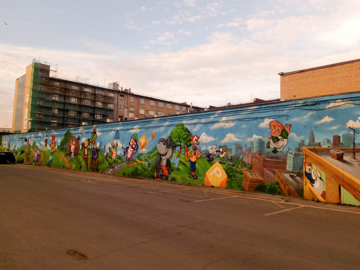 Гулял сегодня на улице, встретил такую вот картину: напротив детского сада во всю стену, были нарисованы такие прекрасные иллюстрации, тут вам Чебурашка с Геной, и кот Леопольд, Кеша и многие другие. Все такие весёлые и счастливые прям не верится.