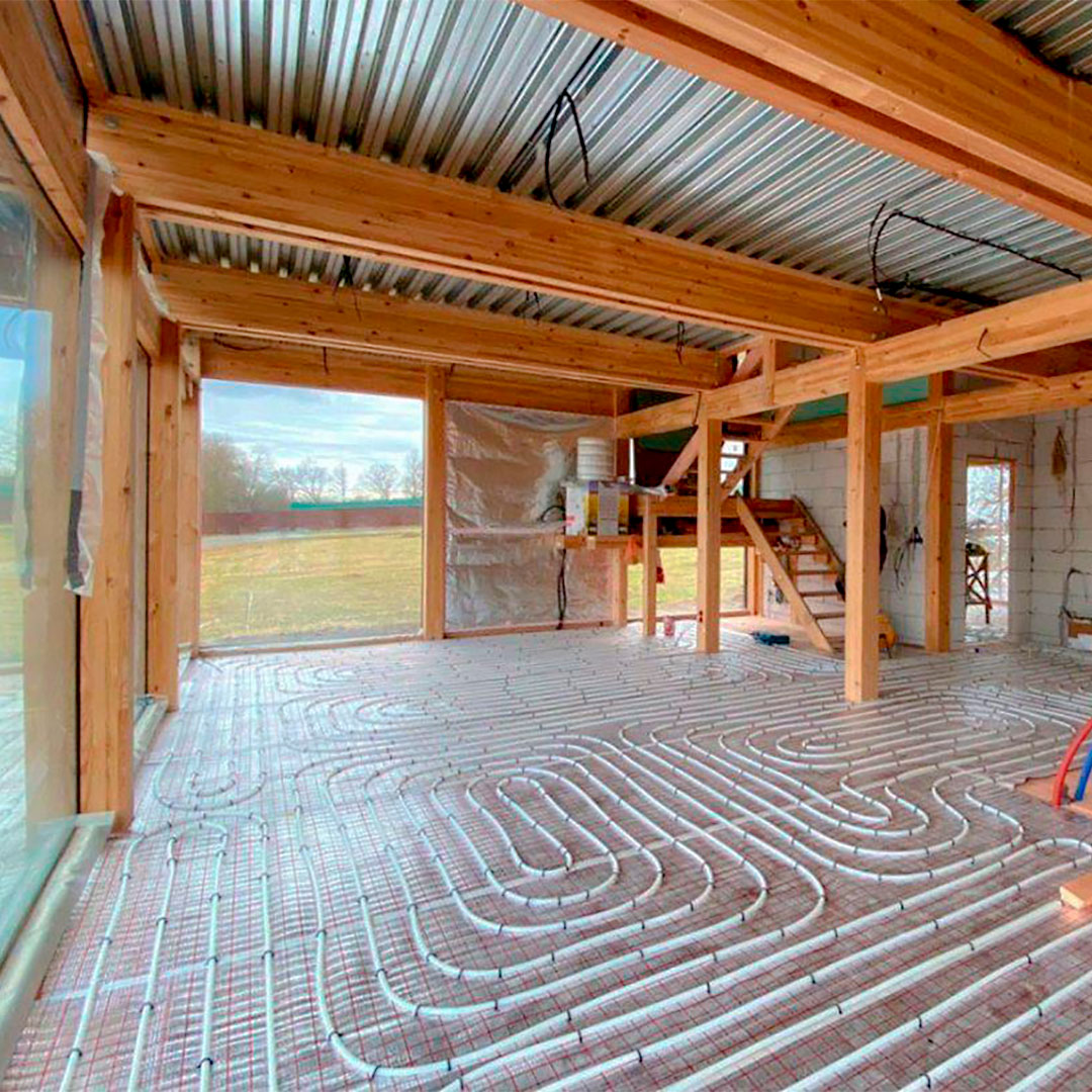 Монолитный фундамент и массивное перекрытие фахверкового дома позволяют легко применить в нем самое эффективное на сегодняшний день отопление - водяной теплый пол. - Данный вариант отопления является максимально комфортным, ведь теплый воздух понимается с самого низа, делая весь объем помещения равномерно прогреваемым, а сам пол теплым. - Водяной теплый пол максимально подходит для фахверкового дома с его минималистичным интерьером ведь все коммуникации скрыты. - Водяной теплый пол, в отличии от электрического, позволяет использовать самые разнообразные напольные покрытия. - Применяя водяной теплый пол вы не ограничены в расстановке и перестановке мебели т.к. наличие, например под кроватью проложенных коммуникаций никак и ни на что серьезно не влияет. - Водяной теплый пол работает совместно с температурными датчиками, поддерживая в доме заданную температуру и может быть интегрирован в систему умного дома. - Наличие бетонной стяжки над проложенной системой делает такое отопление инертны