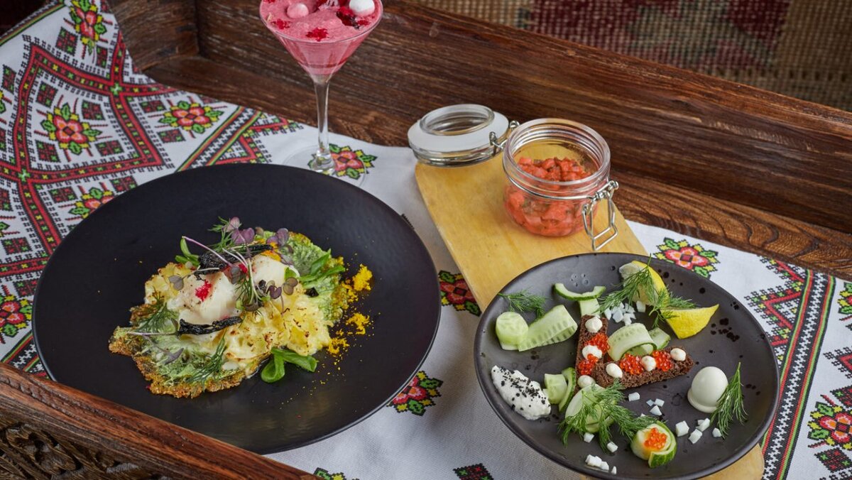 Русско-украинское застолье начинается в первом сете с рубленой семги с красной икрой и кнелями из домашней сметаны. Не останавливайтесь, сразу переходите к основному блюду – треске с древесными грибами и зеленым салатом. Треска готовится на пару с прованскими травами, белые грибы запекаются в сливочном масле, черные обжариваются отдельно, листья китайского салата припускаются на чесночном масле. Дополняет картину апельсиновый хлеб, выпеченный с добавлением апельсинового сока вместо привычных воды и молока. На дижестив – крем-мусс из клюквы, выложенный слоями в бокале для мартини. Свежая протертая клюква и битая меренга перемежаются крошкой из орехов и семечек.
