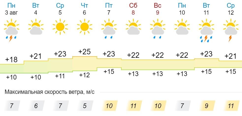 На неделе с 3 по 9 августа в Кировскую область придет потепление. Столбики термометров покажут отметки в +22°C… +25°C. Самым теплым днем недели, по прогнозу синоптиков, станет четверг. Именно в этот день ожидаются максимальные +25°C. В среду и пятницу – чуть прохладнее. В эти дни столбики термометров не поднимутся выше +23°C. Выходные покажут свои стабильные +22°C. А самым холодным днем на неделе станет понедельник с его +18°C. Теплее одеваться жителям Кировской области придется во время ночных прогулок. На неделе ожидается +10°C… +13°C. Дожди возможны в понедельник, пятницу и воскресенье. В остальные дни – солнечно, временами небольшая облачность. Скорость ветра будет постепенно нарастать в течение недели. И, если в понедельник ожидается 7 м/с, то к выходным уже до 10 м/с.