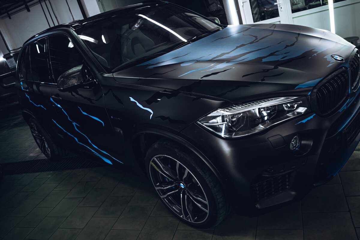 Представляем вам шикарный проект, реализованный мастерами нашей студии WrapCar. Владелец автомобиля заказал эксклюзивный дизайн для своего брутального «немца» BMW X5M. Дизайн создавали с нуля. В ходе обсуждений подбирали подходящие виниловые пленки, конкретизировали цветовую гамму. В результате получился дерзкий, привлекающий внимание образ. Шикарный дизайн, который идеально выражает мощь этого X5M. В проекте использовалась новинка мира пленок – кованый карбон. Также успешно реализовали идею со свечением надписи «VINYLRUSSIA» в темноте. Этот эффект достигнут благодаря светоотражающей̆ пленке. Поверх винилографии нанесена полиуретановая защита, которая убережет наш дизайн от различных повреждений, возникающих в процессе эксплуатации транспортного средства. Потенциальные виновники сколов и царапин на авто: песок, камни, ветки деревьев, химические реагенты и так далее. Любую винилографию всегда рекомендуется ламинировать прочными защитными пленками, что мы и сделали. Теперь этот кр