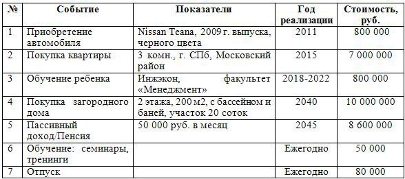 Поэтому необходимо знать конкретные характеристики цели: например, автомобиль Nissan Teana, 2009 года выпуска, черного цвета, с кожаным салоном, объемом двигателя 2.0. Чем больше конкретики, тем лучше. Далее необходимо прописать стоимость и срок достижения, т.е. дату покупки с точностью до года. Таким образом, Ваши цели будут собраны в таблице событий: