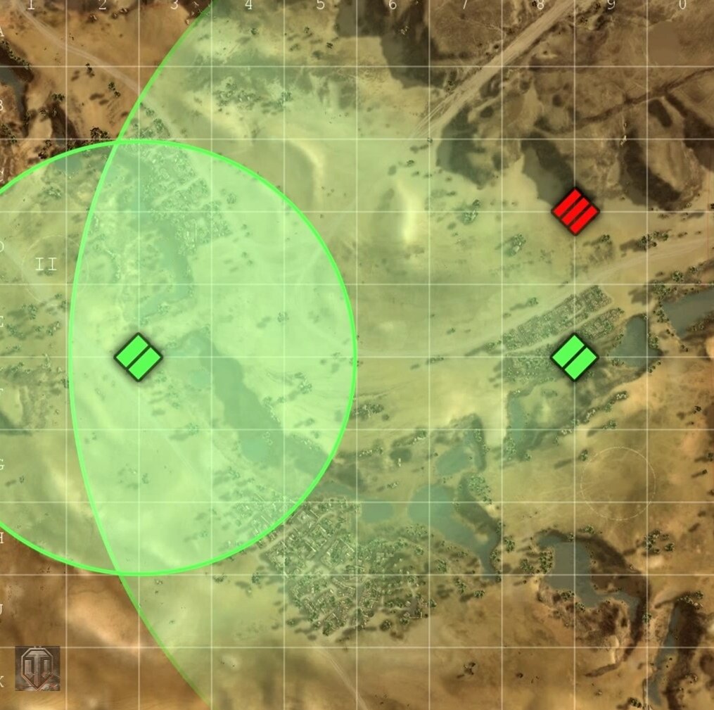 Слева стоит союзный танк со слабой радиостанцией . Справа стоит союзник с хорошей радиостанцией. Если вдруг противник вылезет здесь, то игрок с мощной радиостанцией сможет передать союзнику координаты противника, и у обоих игроков этот красный тяж появится на миникарте.