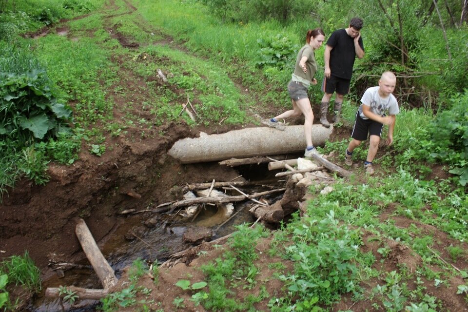 Начальной проблемой стала промоина посреди дороги метровой глубины, там ручей, дорога размыта. После исследования окрестностей выбрали маршрут объезда. Прям по ручью, только чуть ниже по течению.