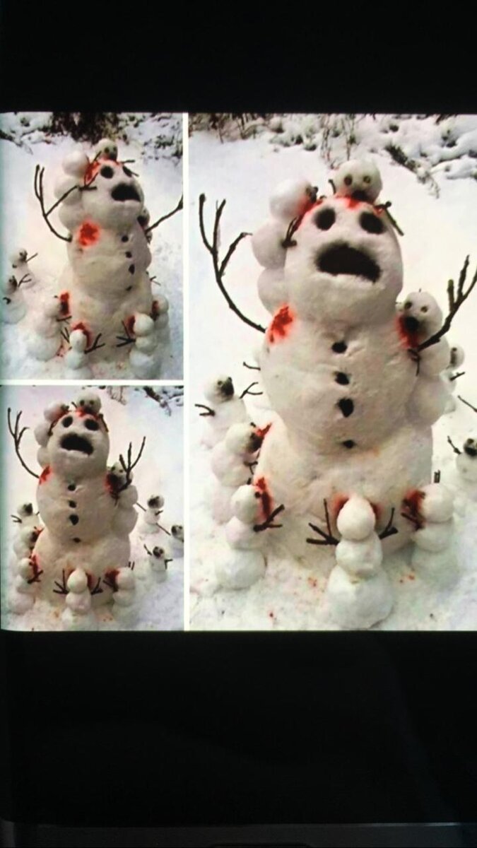 Кто знает что можно сделать со снеговиком? Тогда читайте до конца. Можно сделать как будто маленькие снеговики поедают большого. Сделать это легко. Лепишь снеговиков, раскрашиваешь и прикрепляешь маленьких к большому. Здесь нужно на палки, воткнутые в снеговика нацепить штаны и кроссовки. Не забыть одеть и самого снеговика. Ну и самое сложное. Я думаю вы знаете как их сделать)))))