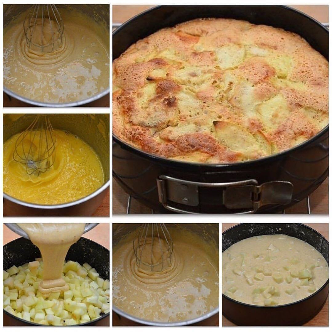 Ингредиенты: 1. 2-3 яблока, 2. 1 чашка муки (чашка 240 мл), 3. 1 чашка белого мелкого сахара, 4. 3 крупных яйца, 5. щепотка соли, ᅠ 6. 1/2 ч.л. корицы, 7. 1/2 ч.л. ванильной эссенции, 8. 1 ст. л. крахмала (по желанию), 9. сахарная пудра для присыпки (по желанию). ᅠ Приготовление: 1. Нагреваем духовку до 180 градусов. Смешиваем муку, соль и корицу. Если добавляете крахмал, то и крахмал. Взбиваем яйца и сахар, пока масса немного не посветлеет и немного увеличится в объеме, электровенчик справляется с этой задачей за 3-4 минуты. ᅠ 2. Постепенно добавляем к яичной смеси мучную смесь, продолжаем взбивать до однородной массы. Яблоки (или груши) очищаем от кожуры и нарезаем кубиками или пластинками. Как показала практика, пластинками лучше. Но кому как больше нравится. ᅠ 3. Разъемную форму сбрызгиваем растительным маслом и мукой. Форма 22 см в диаметре, 6 см высота. На дно формы выкладываем яблоки и заливаем получившимся тестом. Тесто должно полностью покрыть фрукты. ᅠ 4. Отправляем