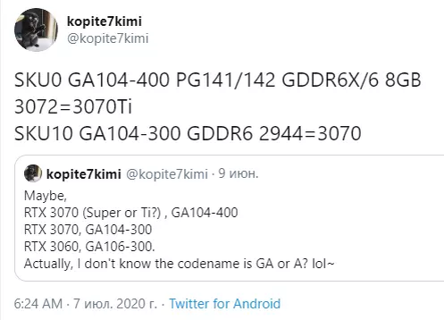 А также недавно в сеть утекли характеристики видеокарт NVIDIA серии GeForce RTX 3070 серия RTX 3070, которая работает на базе графического процессора GA104, будет представлена в виде двух моделей. Так, если старшая модель будет иметь 3072 потоковых процессора и 8 Гбайт памяти GDDR6 или GDDR6X при процессоре GA104-400, то младшая получит видеочип GA104-300 с 2944 потоковыми процессорами и память типа GDDR6, в то время как ее объем, на данный момент, неизвестен.