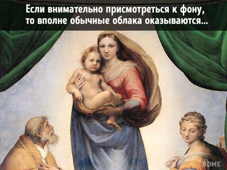 Некоторые картины мы знаем с самого детства, однако не очень тщательно изучали все детали на них. А часто художники придавали особый смысл именно мелочам, которые не так бросаются в глаза, но могут в корне изменить отношение к изображенному сюжету. Рафаэль Санти "Сикстинская мадонна" Доменико Гирландайо "Мадонна со