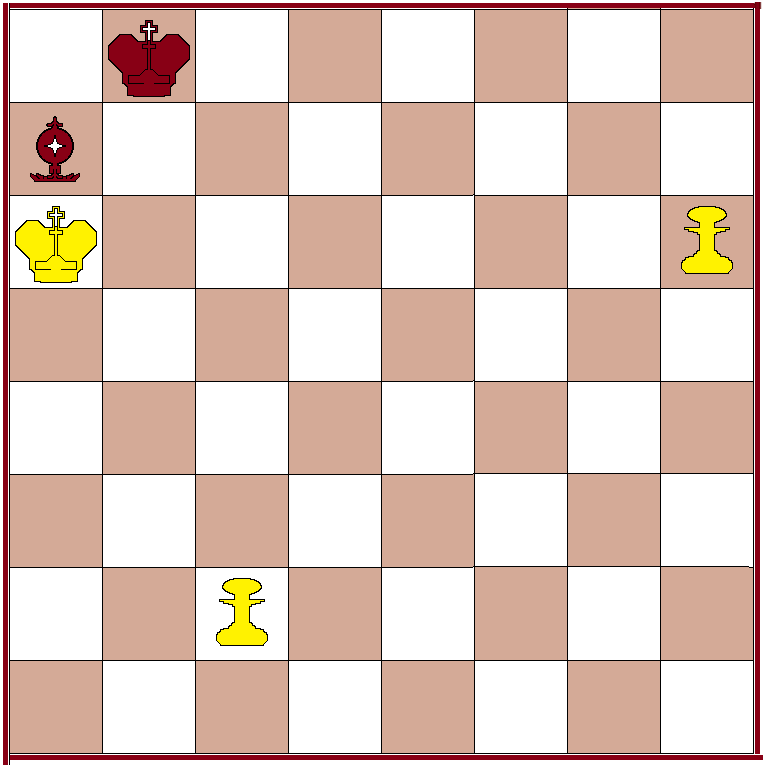 Белые начинают и выигрывают! За свою жизнь мне довелось составить немало самых разных шахматных композиций. Но среди них есть три, которыми я откровенно горжусь. На мой взгляд это бриллианты чистой воды. К ним относится композиция "Мерцающие шахматы. Мат Ллойда". К ним относится задача на мат последней пешкой королю, окруженному в центре своими фигурами, посвящённая памяти австрийского композитора Конрада Байера. И, наконец это этюд, начальная позиция которого перед вами. В этом этюде участвуют всего пять фигур. Три белых и две чёрных. Причём в стартовом положении у чёрных материальный перевес, ибо один слон равен трём пешкам, тогда как у белых пешек только две. Выиграть они могут за счёт исключительно неудачного расположения слона. Поэтому первым ходом белые передвигают пешку с2 на с3 и отрезают чёрному слону возможность встать на поле d4! Теперь совершенно неясно, как помешать пешке белых на краю доски дойти до поля превращения и стать ферзём, после чего чёрные по идее, должны сдава