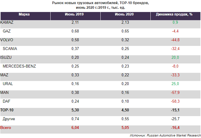 Продажи новых грузовых автомобилей продолжают сокращаться По данным Russian Automotive Market Research, за первое полугодие 2020 г. покупатели в России приобрели 31,3 тыс. ед. новых грузовиков – на 12% меньше, чем в АППГ. В июне 2020 г. продажи грузовой техники упали на 16% и составили 5,1 тыс. ед. Продажи новых грузовиков лидера рынка - бренда KAMAZ – в июне текущего года увеличились на 0,9% и составили 2,13 тыс. ед. За ними следуют грузовые автомобили GAZ, продажи которых сократились на 4,4% до 0,65 тыс. ед. Также в ТОР-3 вошел бренд VOLVO, который реализовал 0,32 тыс. ед. грузовой техники (-44,8%). Помимо бренда KAMAZ, положительная динамика продаж среди первой десятки отмечена у марок ISUZU (+20,0%) и URAL (+25,0%). https://www.napinfo.ru/press-releases/tekushchaya-situatsiya-na-rynke-kommercheskoy-tekhniki