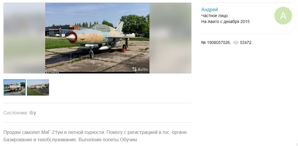 За суперзвуковой самолет МИГ-21УМ в состоянии б/у запросили 70 миллионов рублей. На фото видно что самолет не один, возможно что 2 продается. Это объявление сразу же разлетелось не только по новостным сайтам и пабликам города, но и по федеральным каналам. Интересно еще то, что самолет полностью в летной готовности. В объявлении обещают даже помочь в регистрацией сего транспортного средства в государственных органах. Оказать услуги по базированию и техническому обслуживанию. Обучить и выполнить полеты. Так сказать все под ключ. Давно такого на авито не находил. Подписывайтесь на канал и следите за новыми подборками. ставьте большой палец вверх, чтобы помочь развитию канала. Если заинтересовали товары - пишите в комментарии.