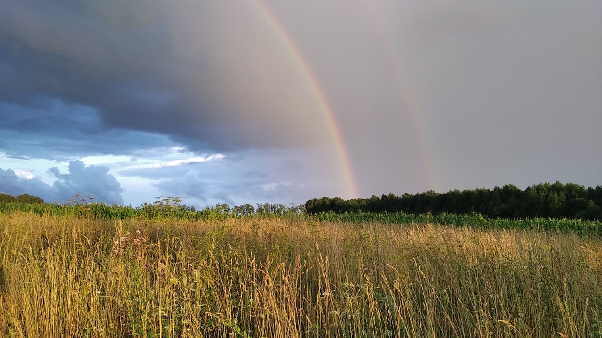 Накануне, в четверг мы заготовили необходимые для сборки катамаранов жерди. После дождя на окраине деревни сияла радуга.