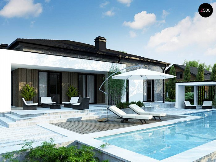 Z466 представляет собой современную версию традиционного одноуровневого дома с функциональным расположением комнат и гаражом на 2 авто.