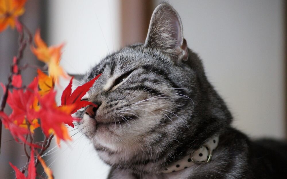 Прицепился недавно к рукаву сухой кленовый лист, а я и не заметила. Зашла в комнату за телефоном, в рабочей одежде, да и стряхнула нечаянно этот шуршащий красноватый листок на пол. Яркий такой, на светлом линолеуме, он моментально привлёк к себе внимание обоих кошек. Поначалу они насторожённо оглядывали незнакомый предмет, обнюхивали, аккуратно трогали лапкой. А потом пошли гонять по всему полу новую забавную игрушку! Отбирать не стала, дала вволю натешиться, и только когда к нему интерес пропал - аккуратно смела с пола в совок.