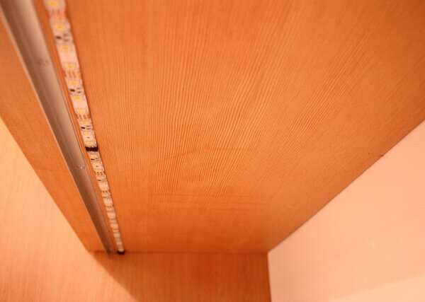 В тех местах, где светодиоды крепятся к полке, ставят небольшой уголок, в дальнейшем он поможет в создании скрытой подсветки. Это нужно, если лента портит дизайн шкафа.