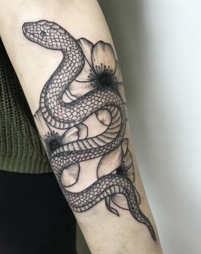 Существует огромное количество изображений для татуировок. Но что они значат и как не набить что-то «плохое» для себя? 1. Змея. Изображение змеи – одно из самых популярных тату. Из-за своей извилистой формы ее предпочитают бить на руках. Но также нередко ее можно встретить и на ноге, спине и других частях тела. Резко негативного значения у изображения змеи нет. Качествами змеи считаются: изворотливость, коварство, мудрость, умение переждать трудности. Однако, в Библии именно Змей совратил Еву, поэтому на территории России изображение змеи считается опасным, хоть и не сильно отрицательным. Если змея кусает себя за хвост, то считается, что это символ круговорота жизни, бессмертия. Змея, обвивающая кинжал, считается символом медицины. Змея и череп служат напоминанием о быстротечности жизни и неизменном ее конце. 2. Цветы Несмотря на предрассудки, что цветы в большинстве набивают женщины, изображение цветов на теле также популярно и среди мужчин. В основном цветы несут добрый