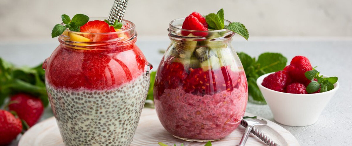 Смешать воду, мёд и кокосовое молоко, добавить семена чиа и оставить на ночь. Утром распределить массу по порциям. В отдельных стаканах промиксировать клубнику и малину, добавить в порции к чиа. Киви очистить от кожуры, нарезать дольками. Семена чиа можно смешать с фруктовым пюре, а можно оставить все слоями. Сверху украсить мятой и кусочками киви.