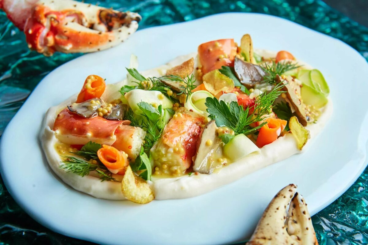 Цуккини обжарить на растительном масле, посолить, выложить на тарелку, в этой же сковороде, обжарить крабовое мясо, петрушку и нарезанные кубиком помидоры, добавить перец и соль, прогреть в течении 3 минут, выложить соус на цуккини.