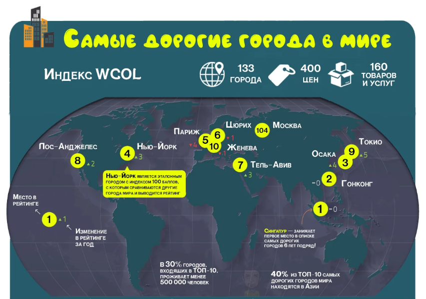 Сайт Worldwide Cost of Living от Economist Intelligence Unit ежегодно изучает, в каких городах мира жить дороже всего. Ниже представлено всемирное исследование стоимости жизни путем сравнения индексов стоимости жизни в разных городах от Нью-Йорка и Лондона до Токио и Шанхая. Рейтинг складывается путем анализа данных о ценах на продовольственные и непродовольственные товары (всего около четырехсот цен на товары и услуги в ста тридцати трех городах мира), ценах на жилье, его съём, об уровне заработной платы. Все города мира сравниваются с городом-эталоном - Нью-Йорком. Ему присвоен индекс сто. В этом году Нью-Йорк занял четвертое место. Но давайте пойдем по порядку. Самым дорогим для жизни городом мира признан Сингапур. Эту позицию город-государство удерживает еще с 2014 года. Причины, по которым Сингапур занимает первое место, многообразны. Во-первых, в Сингапуре очень дорогие автомобили, а также очень высокие налоги на них. Это связано со стремлением сделать город самым экологически