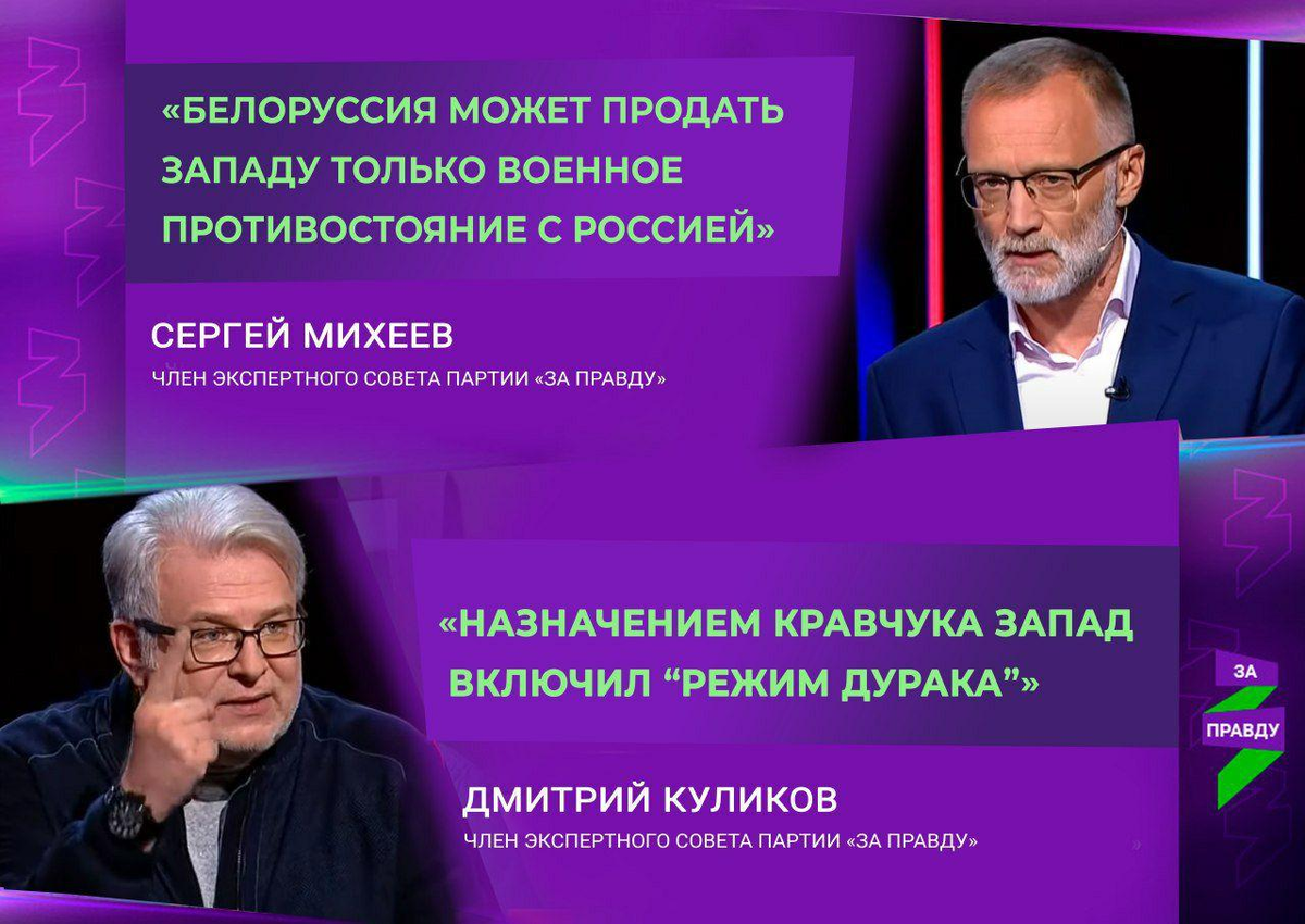 В воскресение, 2 августа, в эфире программы «Воскресный вечер с Владимиром Соловьевым» на телеканале «Россия 1» члены Экспертного совета Партии «ЗА ПРАВДУ» Сергей Михеев и Дмитрий Куликов обсудили ситуацию с задержанием российских граждан в Белоруссии, а также вокруг «обновления» украинских представителей на переговорах в Минске. «Единственное, что может продать Западу Белоруссия, – это военное противостояние России. Это нужно понять и белорусской элите, и белорусским гражданам. Больше ничего. И в этой ситуации вся нынешняя политическая элита будет уничтожена. Это вопрос времени. Очень небольшая группа западно ориентированной элиты получит свои бонусы и хорошо устроится. А основное белорусское население будет под предлогом «новых реформ» нищать. Эта «игра» крайне опасна и для Белоруссии, и для России, но для Белоруссии она самоубийственна. И больше всего в Белоруссии наших конкурентов – ту самую третью силу – раздражает не экономическая модель Лукашенко, ни сам Лукашенко, а только одн