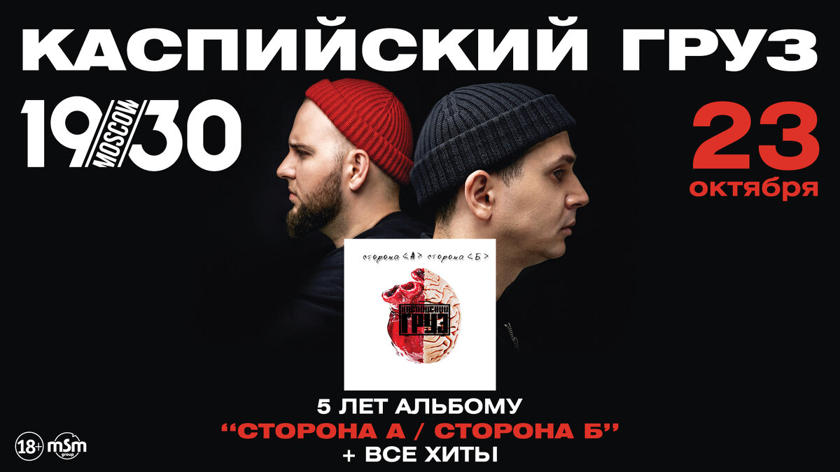 23 октября, клуб «1930 Moscow» Каспийский Груз В этом году группа Каспийский Груз отмечает ровно 5 лет со дня выхода их самого знакового альбома «сторона А / сторона Б». Он вышел 26 января 2015 года и подарил слушателям такие хиты как «Табор уходит в небо», «18+», «Сам все знаю» и другие. И в честь этого маленького юбилея группа даст БОЛЬШОЙ КОНЦЕРТ в Москве, где презентует практически весь альбом «сторона А / сторона Б», плюс ВСЕ ХИТЫ со всех альбомов, как совместных, так и сольных. Купить билет - https://bit.ly/31wGTDJ