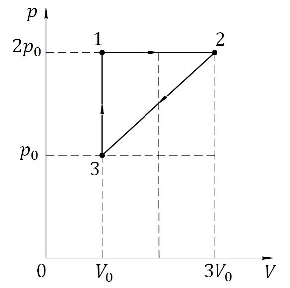 Одноатомный идеальный газ совершает циклический процесс, показанный на рисунке. За цикл от нагревателя газ получает количество теплоты 8 кДж. Чему равна работа газа за цикл? Масса газа в ходе процесса не изменяется.