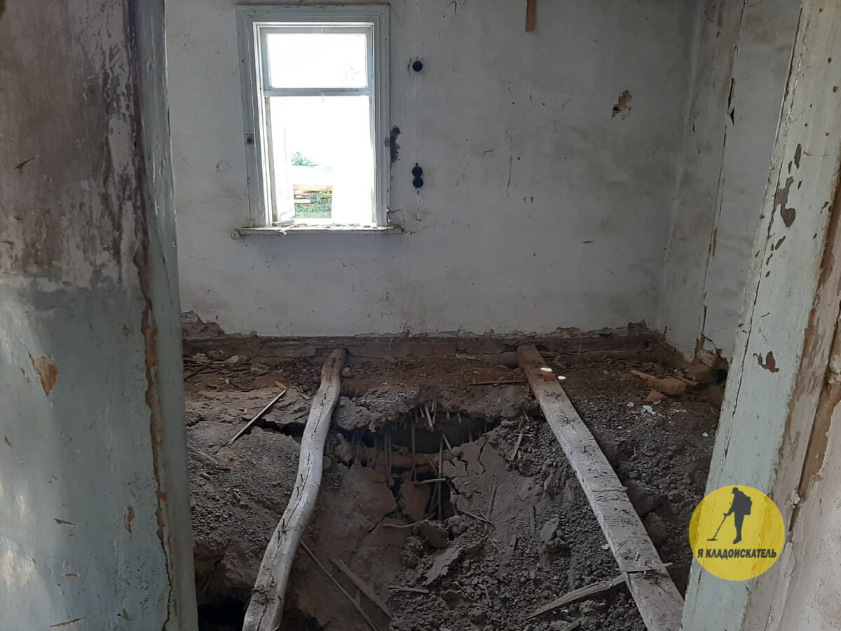 Работы по демонтажу небольшого дореволюционного дома только начались и мы в первую очередь сняли половые доски. Не знаю из какой древесины они сделаны, но крепкие и ещё послужат хозяевам. Мы рассчитывали сразу же после снятия досок начать прозванивать земляную засыпку, но первая находка была обнаружена глазами.