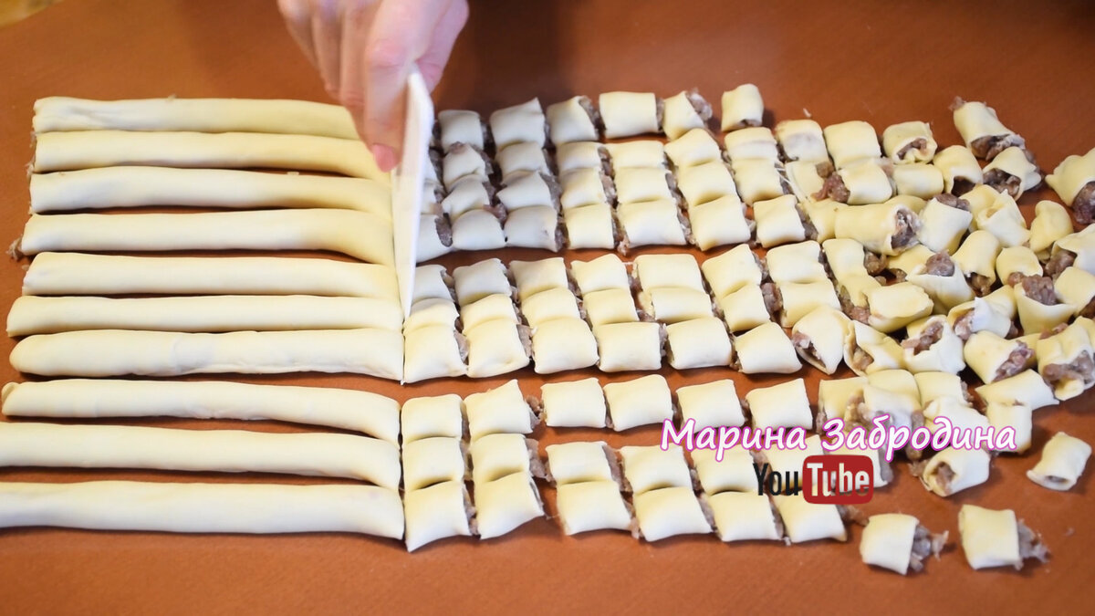 5. На один край каждой полоски выкладываем фарш и накрываем его тестом. Хорошенько скрепляем края, если оставшийся край будет большой, его можно отрезать.