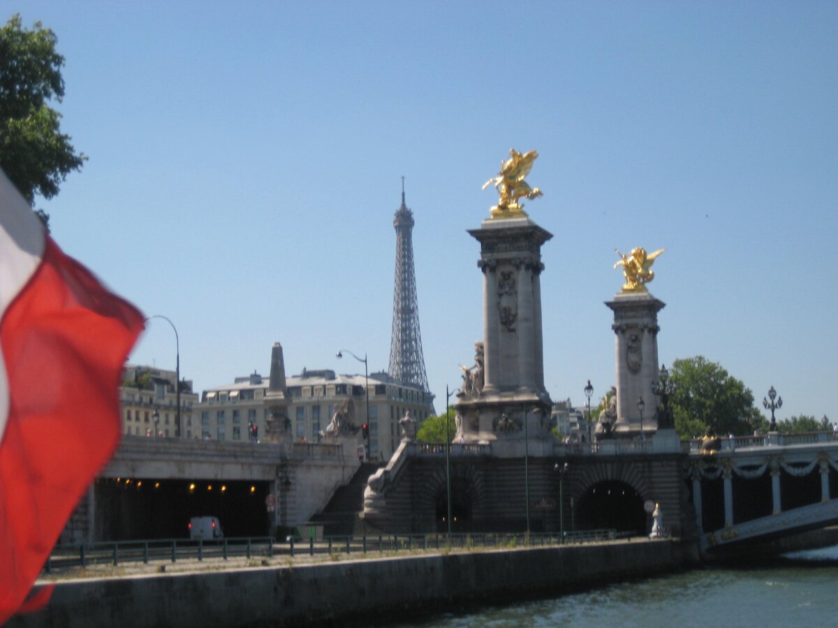Еще одна известная "русская" достопримечательность в центре Парижа - знаменитый Мост Александра III, который по праву считается самым изящным парижским мостом. Он был заложен императором Николаем II в ознаменование франко-русской дружбы и назван императором в честь своего отца. Мост украшают нимфы, ангелы и пегасы, а у подножия фонарей, установленных у въезда на мост можно увидеть 4 бронзовых фигуры, символизирующих Науку, Искусство, Промышленность и Сражение. Но главным украшением моста, как мне кажется, являются два герба - французский и императорской России, которые держат над центральным пролетом нимфа Сены и нимфа Невы. Интересен тот факт, что, одновременно с бело-золотым парижским мостом, в Петербурге французы возвели Троицкий мост.