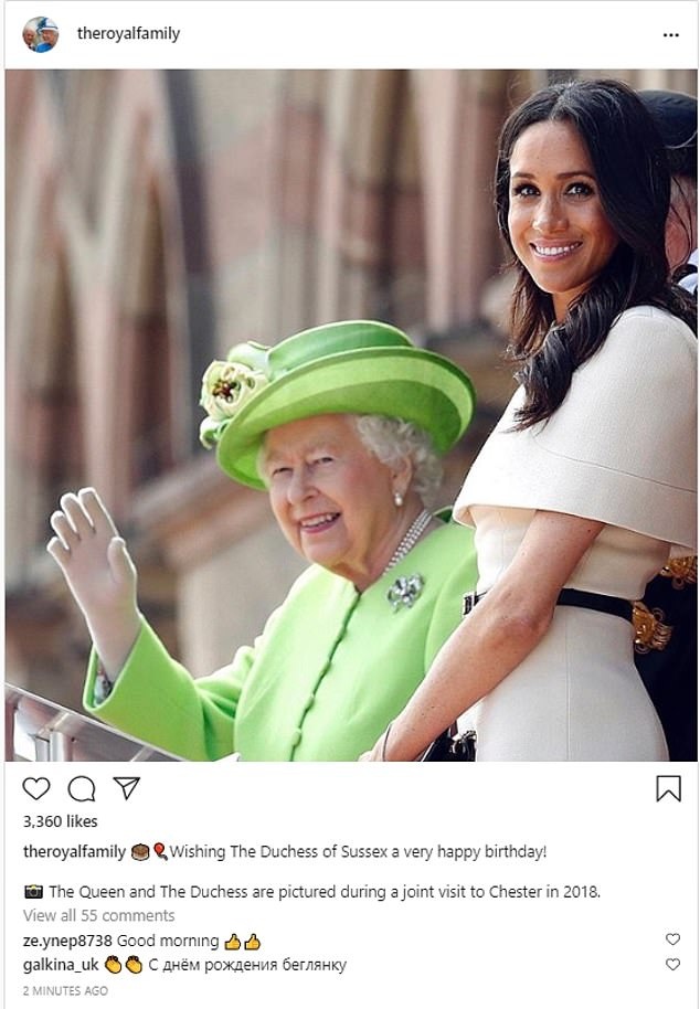 Хотя в прошлом году Королева проигнорировала личный праздник Меган Маркл. В этом она решила поздравить. Утром официальный аккаунт королевской семьи в Instagram опубликовал пожелания герцогине Сассекской всего самого наилучшего в ее 39-й день рождения и фотографию, сделанную два года назад : это был их первый совместный выход в свет. Вскоре за королевским поздравлением, последовали сообщения со страниц Кенсингтонского дворца (от Уильяма и Кейт) и Кларенс-Хауса (от принца Чарльза). Они разместили практические одинаковые послания: «Желаем счастливого дня рождения герцогине Сассекской». Сегодняшние поздравления с днем рождения предполагают, что члены королевской семьи во главе с королевой пытаются подавить разрушительный общественный имидж враждующих семей и выступить единым фронтом. Накануне дня рождения на официальном сайте королевской семьи исчезло подробная биография Меган Маркл. Ранее на портале были описаны все вехи биографии Меган. Особое внимание уделялось её благотворитель