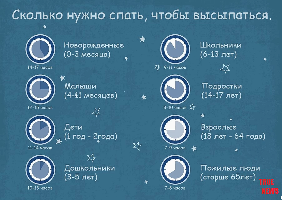 Мы все не высыпаемся, но насколько это серьезно? Кому-то нужно 10 часов, чтобы почувствовать себя человеком, а кто-то и за 7 часов становится бодрым. Институт по изучению сна провел исследование. Ученые доказали, что малышам до 3 месяцев нужно спать не меньше 14-17 часов в сутки, а взрослым (18 лет - 64 года) 7-9 часов сна обеспечат хорошее самочувствие. Согласно проведенному опросу, 30 процентов работающих людей спят максимум 6 часов. А ведь недосып приводит к серьезным последствиям - начиная от раздражительности и депрессии, заканчивая диабетом и даже онкологическими заболеваниями. Вот сколько сна требуется организму в разном возрасте: Новорожденные (0-3 месяца) - 14-17 часов Малыши (4-11 месяцев) - 12-15 часов Дети (1 год - 2года) - 11-14 часов Дошкольники (3-5 лет) - 10-13 часов Школьники (6-13 лет) - 9-11 часов Подростки (14-17 лет) - 8-10 часов Взрослые (18 лет - 64 года) - 7-9 часов Пожилые люди (старше 65лет) - 7-8 часов