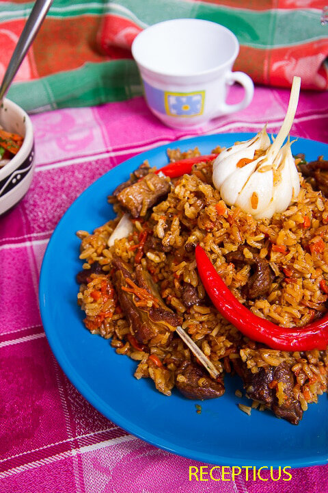 Ну что, выкипела вода? Убавьте огонь до минимума, посыпьте рис остатками зиры и накрывайте крышкой: еще минут 20 плов будет «париться». После этого снимайте крышку, аккуратно перемешайте плов и выложите его на большое блюдо: рис с мясом — вниз, косточки, чеснок и перчики — сверху. Подавайте с горячим зеленым чаем и салатом, и помните: плов — блюдо, которое требует компании и выносливости. После того, как силы иссякнут, постарайтесь открыть в себе второе дыхание!
