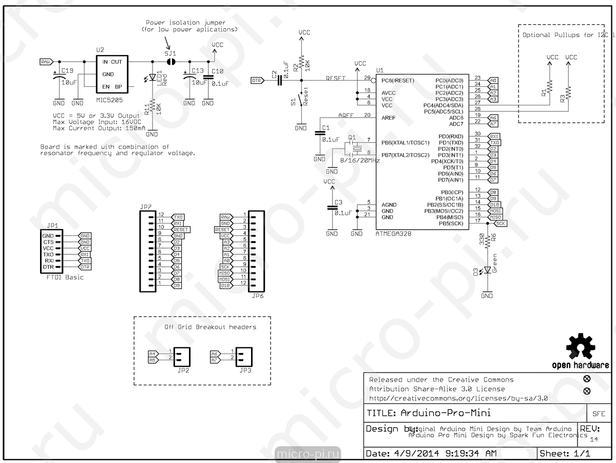 Существует 2 модели микроконтроллера arduino pro mini – на 3,3 В и 5 В. В первой используется тактовая частота 8 МГц, вторая работает на 16 МГц. Какая именно это модель, должно быть указано на корпусе.