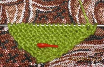 Поворачиваем работу, первую петлю снимаем, 7 лиц., 9-ю петлю и боковую вяжу вместе лицевой.