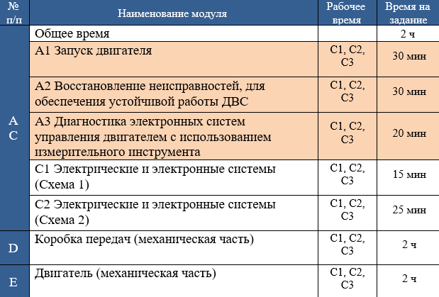 Участник должен самостоятельно выполнить модули по компетенции «Ремонт и обслуживание легковых автомобилей». Каждый модуль может состоять из одной или нескольких частей.