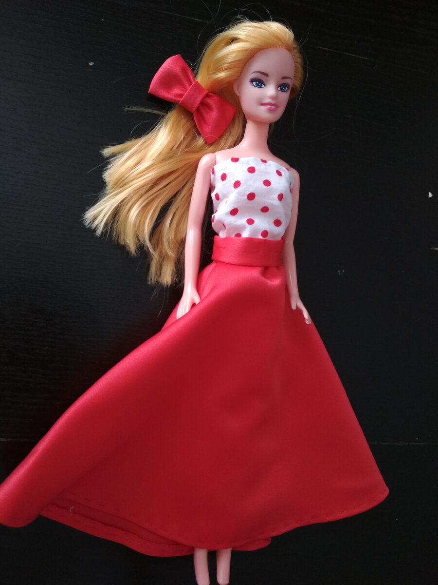 У меня накопилось очень много разных тряпочек от предыдущих швейных изделий. Выбрасывать на произвол судьбы даже такие крохотные кусочки мне всегда очень жалко. Поэтому, я решила и для них найти хорошее применение, а именно я буду шить из них одежду для кукол (барби). Я давно здесь не была, но если просмотреть прошлые статьи, то можно увидеть из каких изделий остались эти ткани. Но всё же напомню, из красной ткани, я шила красную юбку, а из белой в красный горошек – рубашку. И вот теперь я хочу вам представить платье для куклы барби.