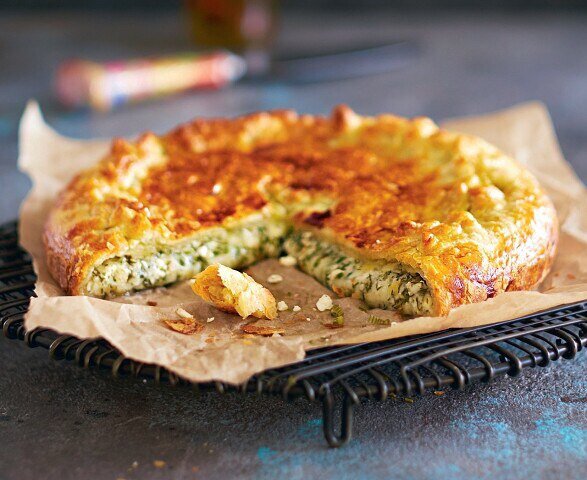 Ингредиенты: Слоеное дрожжевое тесто — 500–600 г Укроп — 200 г Сулугуни — 200 г Брынза — 150 г Сливочное масло — 50 г Свежемолотый черный перец — по вкусу Яйцо — для смазывания Приготовление: 1. Разогрейте духовку до 180 °С. Для начинки промойте укроп, удалите стебли и мелко порубите. Чеснок очистите от кожуры, раздавите и мелко нарежьте. 2. Растопите масло в сковороде, добавьте укроп и готовьте на небольшом огне 2 минуты. Добавьте сыр, поперчите, хорошо перемешайте и снимите с огня. Остудите. 3. Раскатайте 2/3 теста и распределите по форме так, чтобы края немного свисали. Выложите начинку ровным слоем, заверните края теста внутрь. 4. Раскатайте оставшееся тесто, выложите поверх начинки и аккуратно закройте пирог. Накройте полотенцем и дайте пирогу "отдохнуть" 20 минут. 5. Взбейте яйцо и смажьте им пирог. Вилкой сделайте несколько отверстий для выхода пара. Выпекайте до золотисто-коричневого цвета, примерно 40 мин. Остудите перед подачей. Приятного аппетита