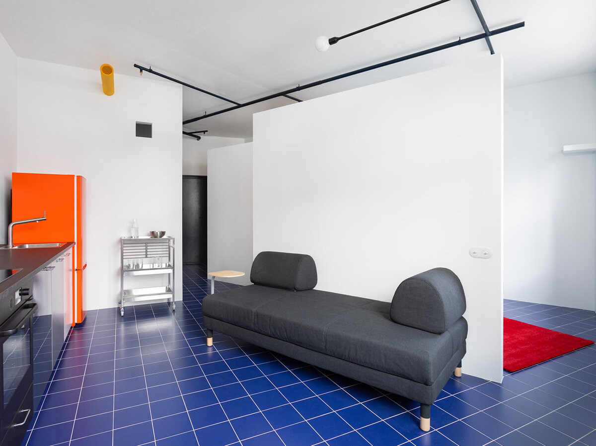 Борис Денисюк подчеркивает, что интерьер вдохновлен проектами Ле Корбюзье. «Лампы, торчащие из стены на кронштейне, взяты из виллы La Roche. Синий пол — из Марсельского дома. Стеллаж на высоких опорах отсылает к домам, «под которыми должны гулять люди». Зеркало напротив окна, на синей стене — символ модернистских окон, не имеющих секций. Стены, не доходящие до потолка, — еще один прием Ле Корбюзье, а подвижная люстра Potence Pivotante, которую выпускает компания Nemo, спроектирована его коллегой Шарлоттой Перриан».