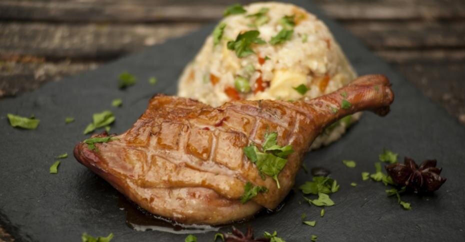 Ингредиенты окорок утиный — 2 шт соус соевый — 120 мл вода — 200 мл сахар тростниковый — 1 ст. л сладкий китайский соус — 2 ст. л чеснок — 2 зубчика бадьян — 3 шт лук репчатый — 1 шт. яблоки вяленые — 70 г перец болгарский — 1 шт замороженный зелёный горошек — 100 г масло растительное рис отварной — 1 ст яйцо — 2 шт петрушка Способ приготовления 1.Приготовим утку. Заливаем окорока соевым соусом с водой, добавляем тростниковый сахар, китайский соус, чеснок и 2 звездочки бадьяна. Подвариваем окорока в получившемся сиропе около 10 минут. 2.По готовности надрезаем окорока по коже, чтобы получилась «сетка», и запекаем на решётке гриля на непрямом жару, периодически поливая оставшимся сиропом. 3.Для гарнира нарезаем кубиком ½ луковицы, вяленые яблоки и 2 стенки сладкого перца. 4.Обжариваем в воке на растительном масле сначала лук и перец, затем добавляем зелёный горошек, вяленые яблоки и предварительно отваренный рис. Прогреваем всё вместе и добавляем 2 ст. л. сиропа. Ряд