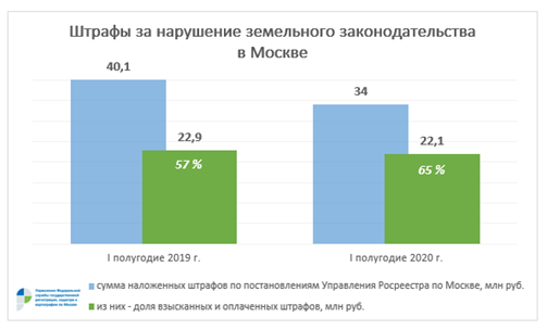 За первое полугодие 2020 года сумма наложенных по постановлениям столичного Росреестра штрафов составила 34 млн рублей, что на 15% меньше первого полугодия 2019 года (40,1 млн рублей). Однако доля оплаченных и взысканных штрафов за январь-июнь 2020 года увеличилась и составила 22,1 млн рублей (65%), в то время как годом ранее данный показатель находился на уровне 57%.
