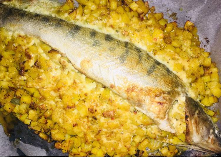 Рыбу можно просто пожарить в масле, но такой блюдо скорее подойдет для повседневной трапезы. А вот для праздничного стола или для того, чтобы порадовать близких, подойдет запеченный судак, фаршированный картошкой! Готовится блюдо минут за пятьдесят. Нам потребуется: - две тушки судака; - две картофелины; - пять зубчиков чеснока; - огурец; - пучок укропа; - масло (нужно растительное); - любые специи. 1. Очистите картошку, порежьте мелкими кубиками, прожарьте на масле. Очистите чеснок, измельчите вместе с промытым укропом, смешайте с картошкой, приправьте специями. 2. Очистите рыбку, выпотрошите, промойте. Не делайте разрез в брюшке слишком большим, а то начинка попросту вывалится из него! Набейте брюшко картошкой. 3. Положите рыбку на противень, залейте растительным маслом. Готовьте при 170 градусах минут пятнадцать. Подается готовый судак на плоском блюде, дополнительно блюдо надо украсить ломтиками огурца и зеленью. На этом все! Вкус действительно восхитительный, дети снач
