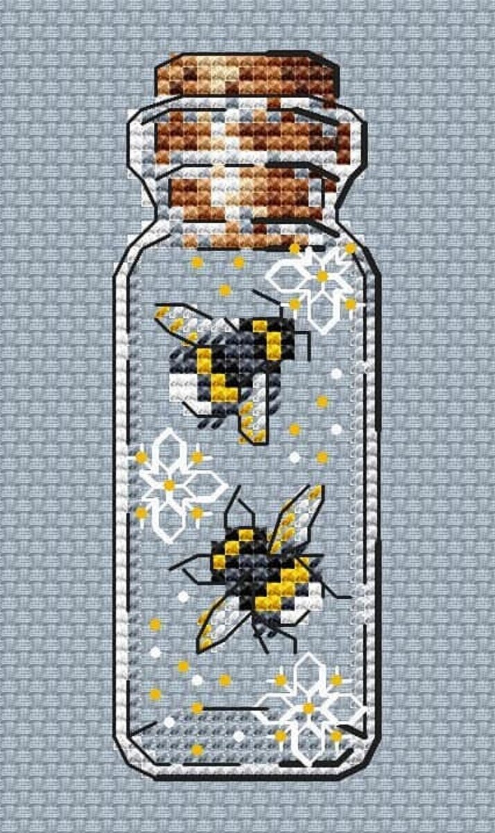 У Ирины целая серия подобных бутылочек, больше всего мне нравится с лисичкой, китом и девушкой на качелях😍 Схема с пчелками носит забавное название - "бжжж" и распространяется совершенно бесплатно 😉
