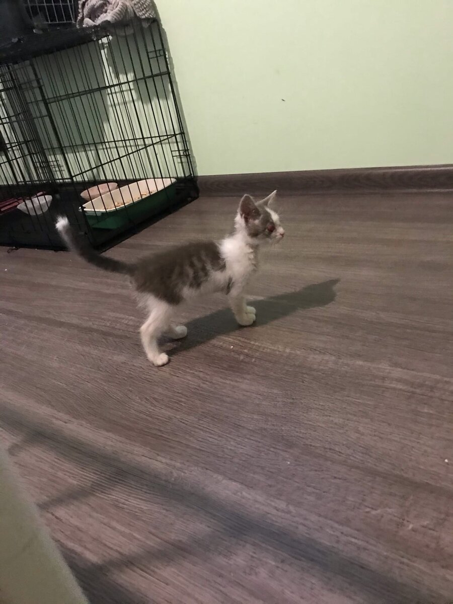 Два раза Слёпа уже съездила в Орёл на обработку глазок лазером и ее глазные яблочки уже значительно уменьшились, стали обычного размера. Это второй наш огромный шаг к нормальной жизни-теперь куратору можно не переживать что Слёпа травмирует свои глазки, так как она уже может из закрывать и это видно на фото! Первым шагом было выжить в первые сутки, Слёпа тогда нас серьезно напугала) Девочка очень активная, если не спит, то играет. Обожает звенелки и шуршалки. И с лотком Слёпа разобралась. Очень долго девочка ходила только на пеленку, но теперь лоток освоен абсолютно без промахов! Кушает котёнка специальный корм рикавери и уже пробовала мясо, ей понравилось) Слёпа живет в клетке, но одиночество ей не
