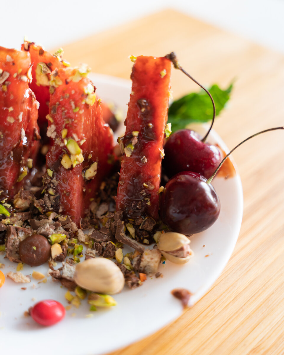 Идея для тех, кому арбуз кажется недостаточно сладким: нарезаете арбуз любым способом — кусочки, рыбки, кружочки. Шоколад растапливаете на водяной бане. Окунаете наполовину арбузную дольку в шоколад и отправляете в холодильник, пока шоколад не затвердеет. А дальше просто сыпете фисташки, M&M's и крохотные маршмеллоу.