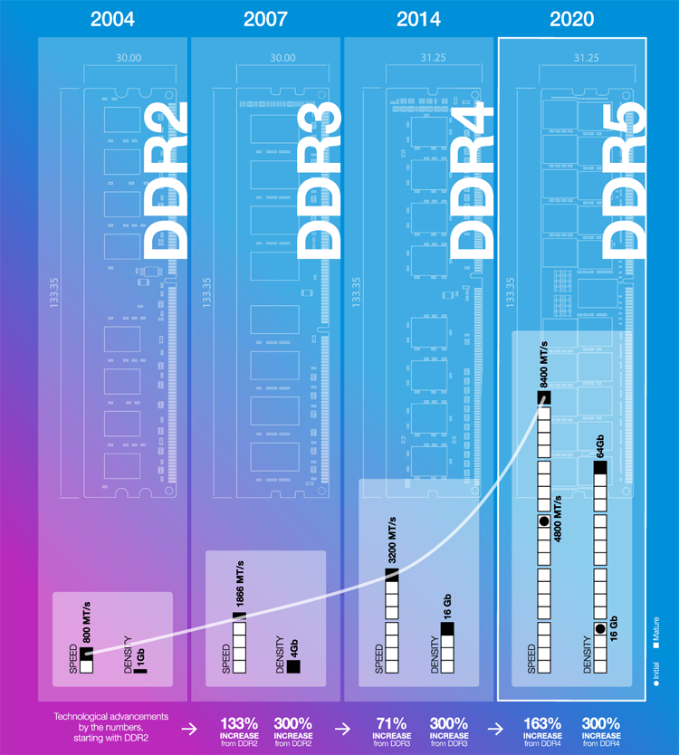 Комитет JEDEC, отвечающий за разработку и стандартизацию компьютерной памяти, объявил о готовности финальной версии спецификации DDR5 SDRAM. Новый тип памяти обещает стать причиной серьёзных изменений привычных платформ: стандарт предусматривает как минимум двукратное увеличение пиковых скоростей вместе с кратным ростом ёмкости модулей. Утверждение спецификации DDR5 профильным отраслевым комитетом открывает новому стандарту путь на рынок, и можно ожидать, что первые системы с DDR5 SDRAM появятся уже в следующем году. Но внедрение, очевидно, начнётся с серверного сегмента, в то время как в клиентских устройствах новая память обоснуется несколько позднее. Тем не менее, ввод в обиход модулей DDR5 SDRAM должен достаточно сильно изменить привычные вычислительные системы. Основное внимание при разработке DDR5 SDRAM было уделено вопросам повышения производительности памяти, которая очевидным образом не поспевает за растущими потребностями многоядерных процессоров. Поэтому ожидается, что