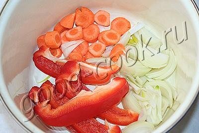 Овощи очистить, у перца вырезать ножку и семена. Крупно порезать и положить в кастрюлю.