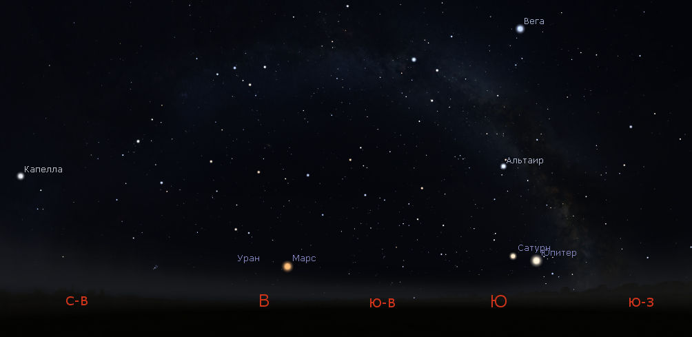 Уран находится в созвездии Овна и в августе 2020 года складываются самые благоприятные условия для наблюдений этой планеты. Она находится высоко над горизонтом, ночи достаточно тёмные, и Уран приближается к точке противостояния, которое наступит 31 октября. Его яркость в августе составит +5.7m, а видимый диаметр – 3”. Видно его ночью и до самого утра, но для поисков лучше воспользоваться биноклем.