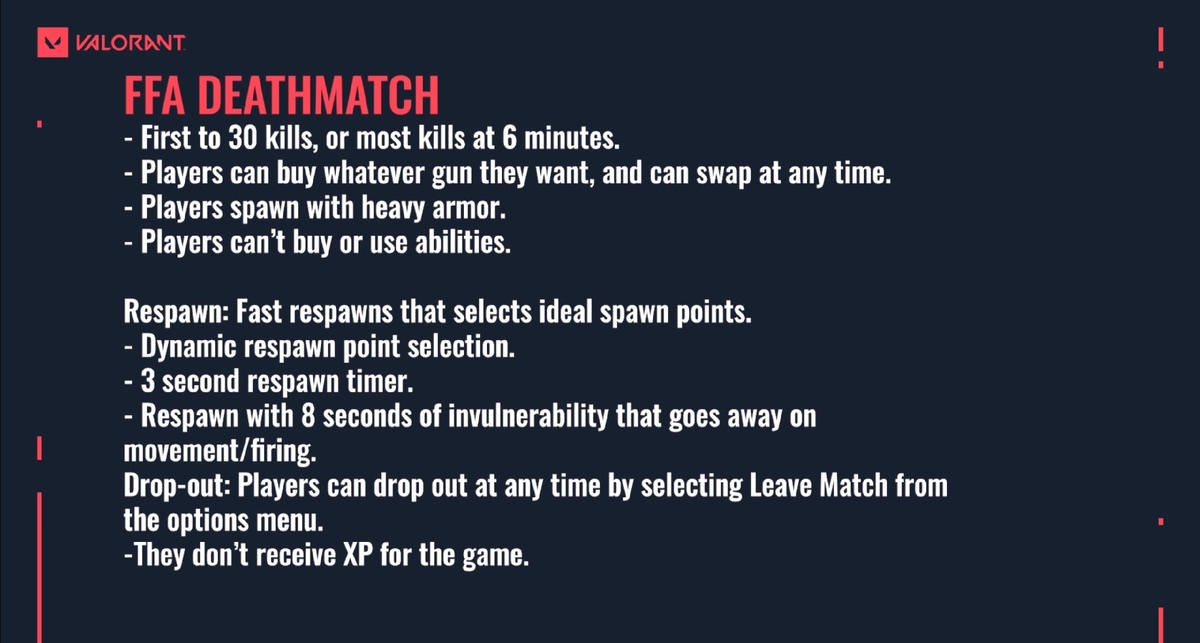 - 10 игроков. Нет способностей. Нет спайка. - Выигрывает первый игрок, набравший 30 киллов, или игрок с максимальным кол-вом киллов за 6 минут. - Игроки могут покупать любое оружие. - Игроки появляются с максимальной бронёй. - Игроки не могут покупать и использовать способности. - Игроки возрождаются в "идеальных" для возрождения местах. - Таймер респауна - 3 секунды. - 8-секундная неуязвимость после респауна, которая исчезает при передвижении/стрельбе. - Ливнуть с матча можно когда угодно. - После убийства врага с него падает аптечка, длящаяся 10 секунд. Если по ней пробежать - у вас станет фуллхп. - Каждые 5 секунд на мини-карте будут отображаться все противники.