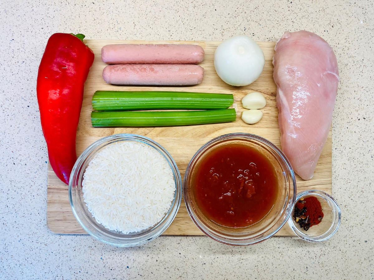 Культовое блюдо креольской кухни из Нового Орлеана! Ингредиенты: Приготовление: 1 шаг: Нарезаем кольцами сосиски и обжариваем на сильном огне в казане (любой глубокой чугунной посуде) с 3-4 ст. л. растительного масла. Достаём шумовкой на тарелку. 2 шаг: Эту же операцию проводим и с куриной грудкой: нарезаем, обжариваем в том же масле, и отправляем к сосискам. 3 шаг: Теперь очередь лука и сельдерея. Только огонь надо немного уменьшить и доставать из казана уже ничего не надо. 4 шаг: Как только лук станет прозрачным, кидаем к нему нарезанный перец и чеснок. Жарим ещё пару минут. 5 шаг: Возвращаем в казан сосиски и мясо, добавляем протертые томаты и все специи. Держим на огне пару минут и вливаем 2 стакана куриного бульона или воды. Солим, перчим и обязательно пробуем на вкус. При необходимости немного правим сахаром, солью и лимонным соком. 6 шаг: Добавляем рис, перемешиваем, закрываем крышкой и переставляем на самый маленький огонь на 15-18 минут. Выключаем нагрев и держим ещё минут 10